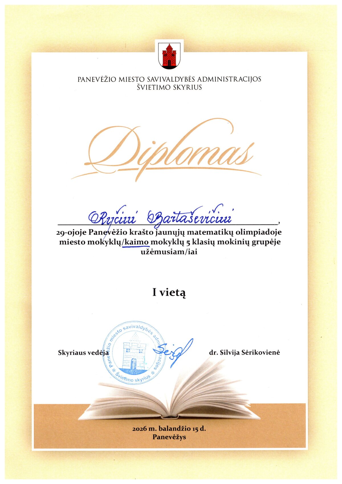 5 klasės mokinys Rytis Bartaševičius iškovojo I vietą. Sveikiname nugalėtoją.