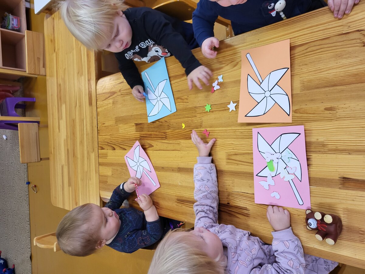 "Debesėlių" grupės mažyliai kartu su mokytoja Audrone puošė "Vėjo malūnėlius" lipdukais.