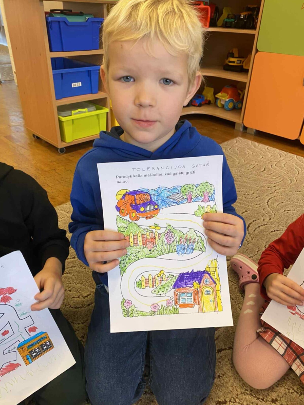 Priešmokyklinukai kartu su mokytoja Neringa kalbėjosi apie tai, ką reiškia būti tolerantiškiems, kodėl svarbu priimti ir gerbti vieni kitus, nepaisant skirtumų. Žiūrėjo trumpą edukacinį filmuką apie draugystę, pagarbą ir pagalbą kitiems. Po diskusijų vaikai kūrybiškai išreiškė savo mintis - piešė "Tolerancijos gatvę", kurioje kiekvienas namelis simbolizavo gerumą, draugystę, pagarbą ir supratimą. Tai buvo puiki proga ugdyti vaikų empatiją, bendrystę ir pozityvų požiūrį į kitus.