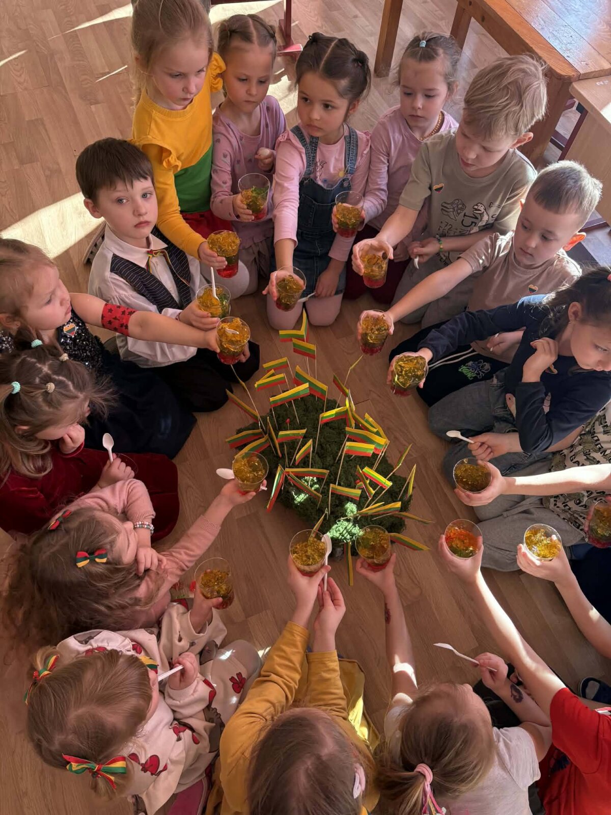 Šventės pabaigą vainikavo kūrybinė užduotis – trispalvės želė sluoksniavimas puodelyje ir gardus jos ragavimas. Bendradarbiaudami, tardamiesi ir žaisdami vaikai surinko daug vėliavėlių ir sėkmingai įvykdė visas užduotis ir linksmai paminėjo Lietuvos Nepriklausomybės atkūrimo dieną.
